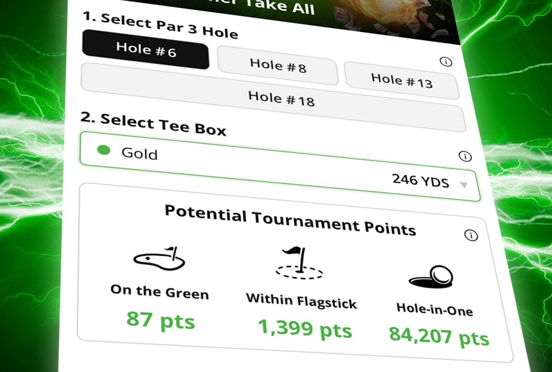 Choose your course location, eligible par 3 hole and tee box. Each attempt has three scoring outcomes: On the Green, Within the Flagstick or a Hole-In-One. More difficult shots earn more points!