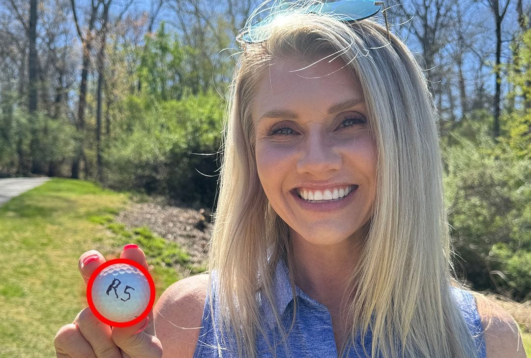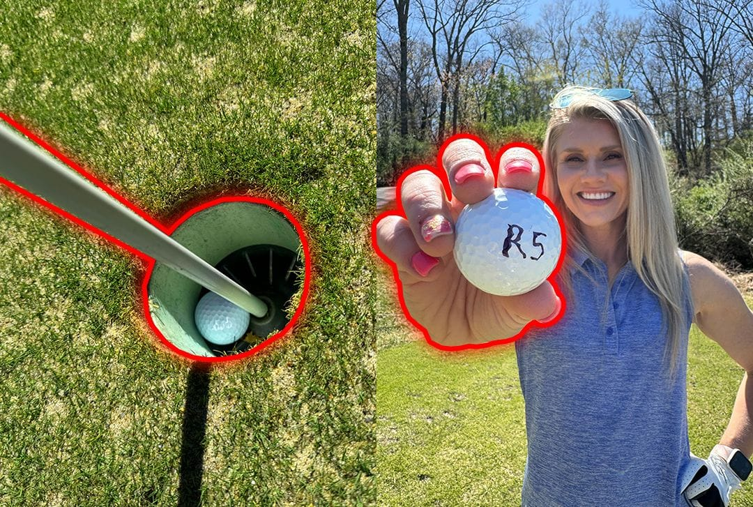 Shows the golfer's face and the ball, with the code visible, after retrieval.
