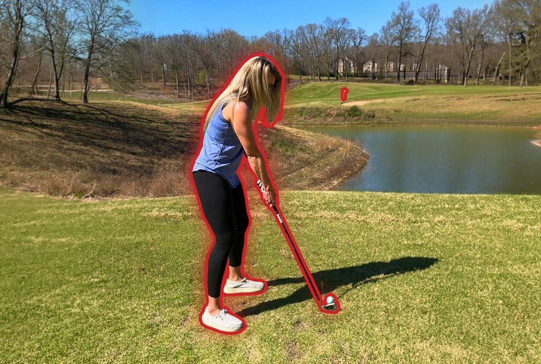 Includes both the golfer’s face and the ball in the same frame initially.
